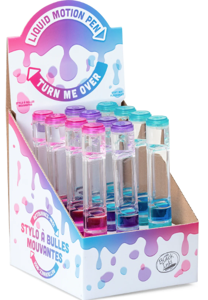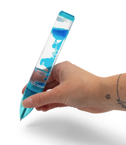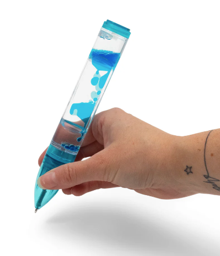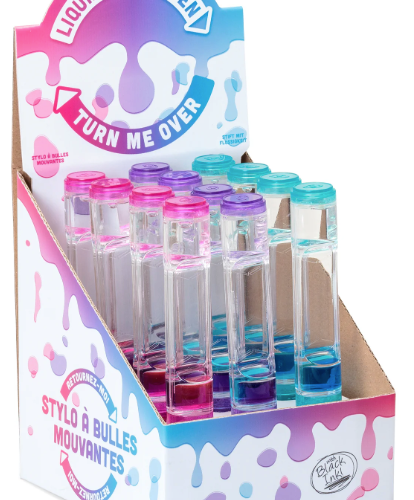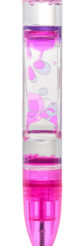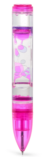 Ball point pen with liquid filled body. Tip the pen upside down or from side-to-side and the colourful blobs inside will form bubbles and slowly gloop around in a hypnotic fashion. Twist the end of the pen and it exposes the nib, allowing you to write as the blobs float around inside the pen body. Available in three different colours