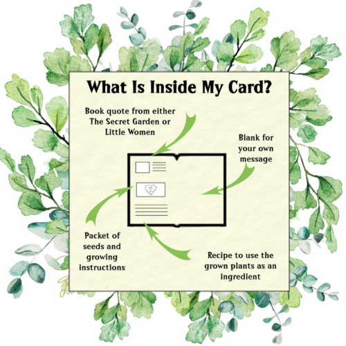 This beautiful card illustrated with classic books contains quotes from Little Women, along with peppermint seeds to sow and grow enabling the recipient to make the Little Women Peppermint Ice-Cream recipe included
