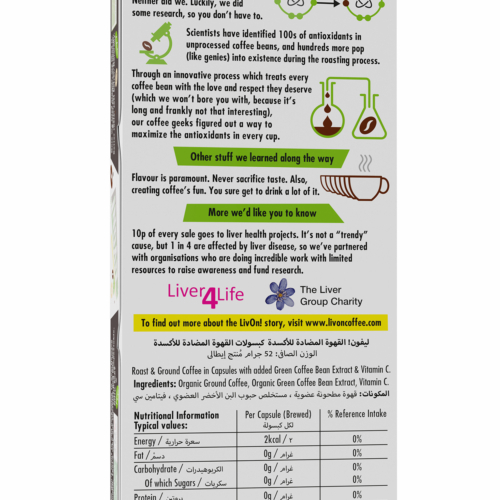 RICH IN ANTIOXIDANTS: At LivOn!, we’re all about coffee that tastes good and does good. Through an innovative process, we maximise the yield of antioxidants in every cup to create great-tasting coffee.