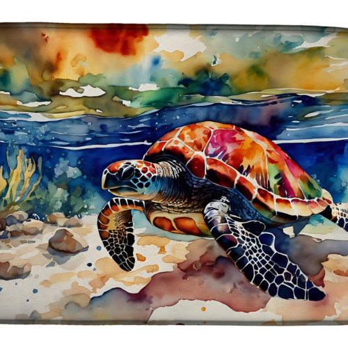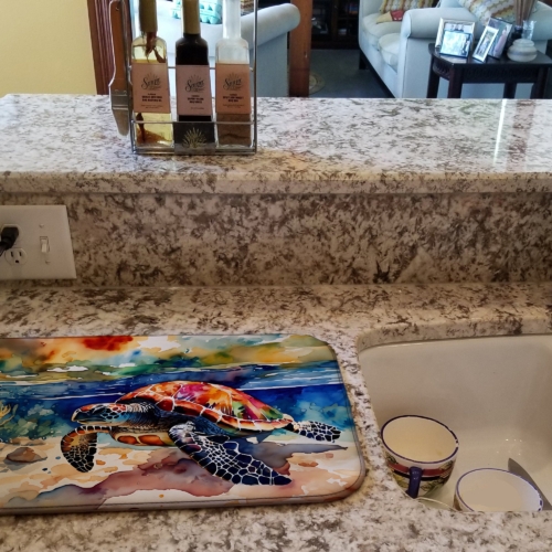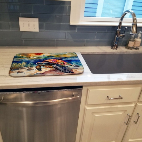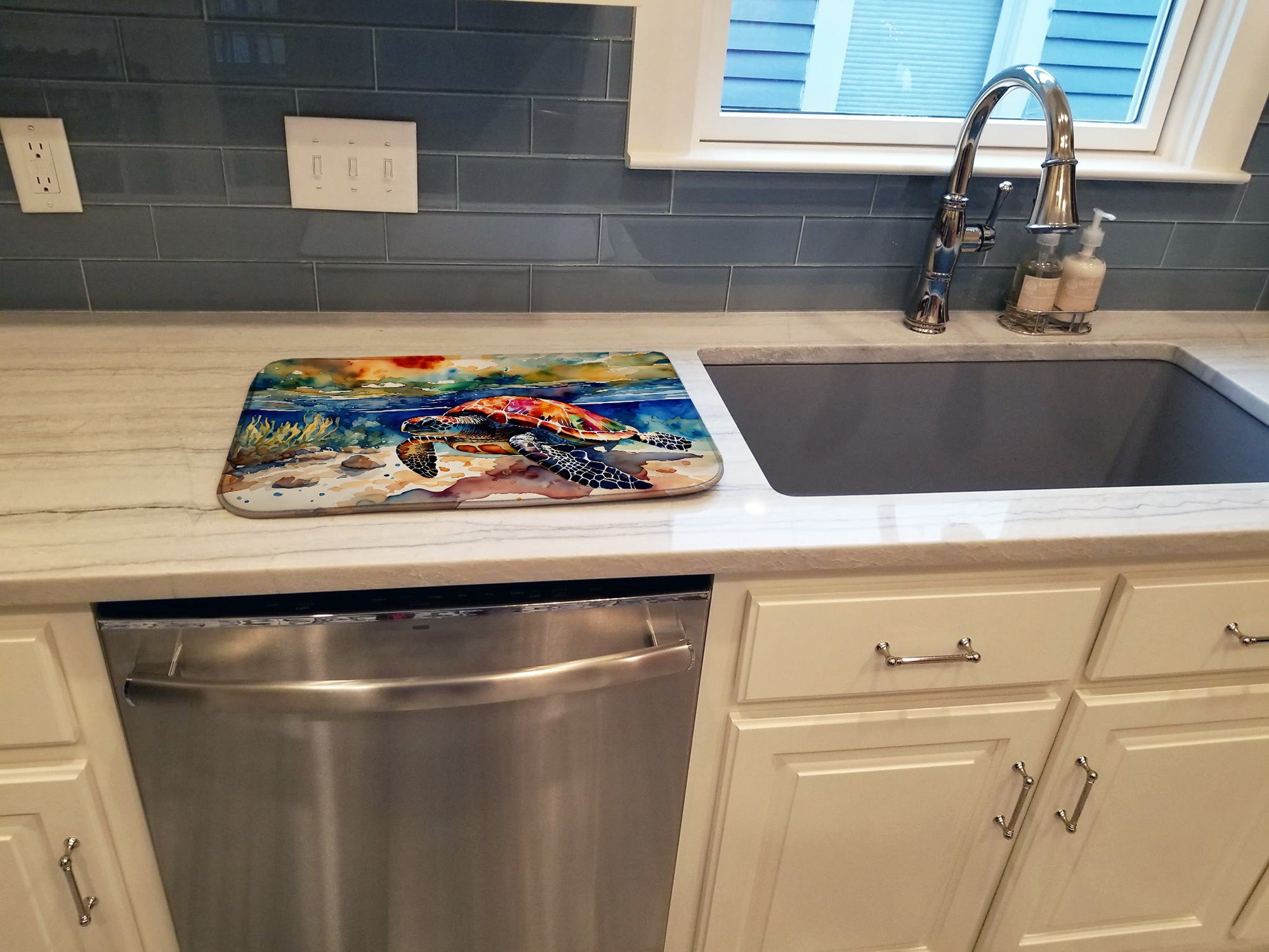 Dish Drying Mat featuring breed specific Loggerhead Sea Turtle artwork. Say goodbye to messy countertops and soggy dish towels with our innovative dish drying mat. Our high-quality dish drying pad is designed to keep your countertops dry while offering a stylish and efficient solution. Whether you’re air drying dishes, glasses, stemware, silverware, pots, pans, bottles, or even fruits and vegetables, our dish mat is the perfect choice. The 14 inches x 22 inches size fits most counters and dish drying racks, and the non-slip design ensures stability. Made with water-absorbent polyester and a polyurethane foam insert, our dish drying mat is not only functional but also durable. It’s machine washable and printed in the USA for long-lasting use. The beautiful artwork adds flair to your kitchen decor, making it a perfect housewarming gift or present for any occasion. Upgrade your kitchen experience with our absorbent and versatile dish drying mat.