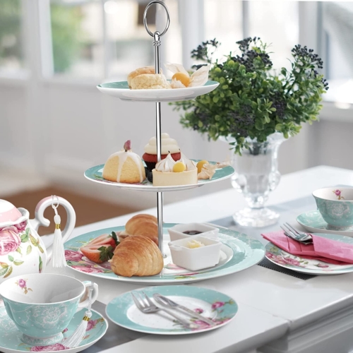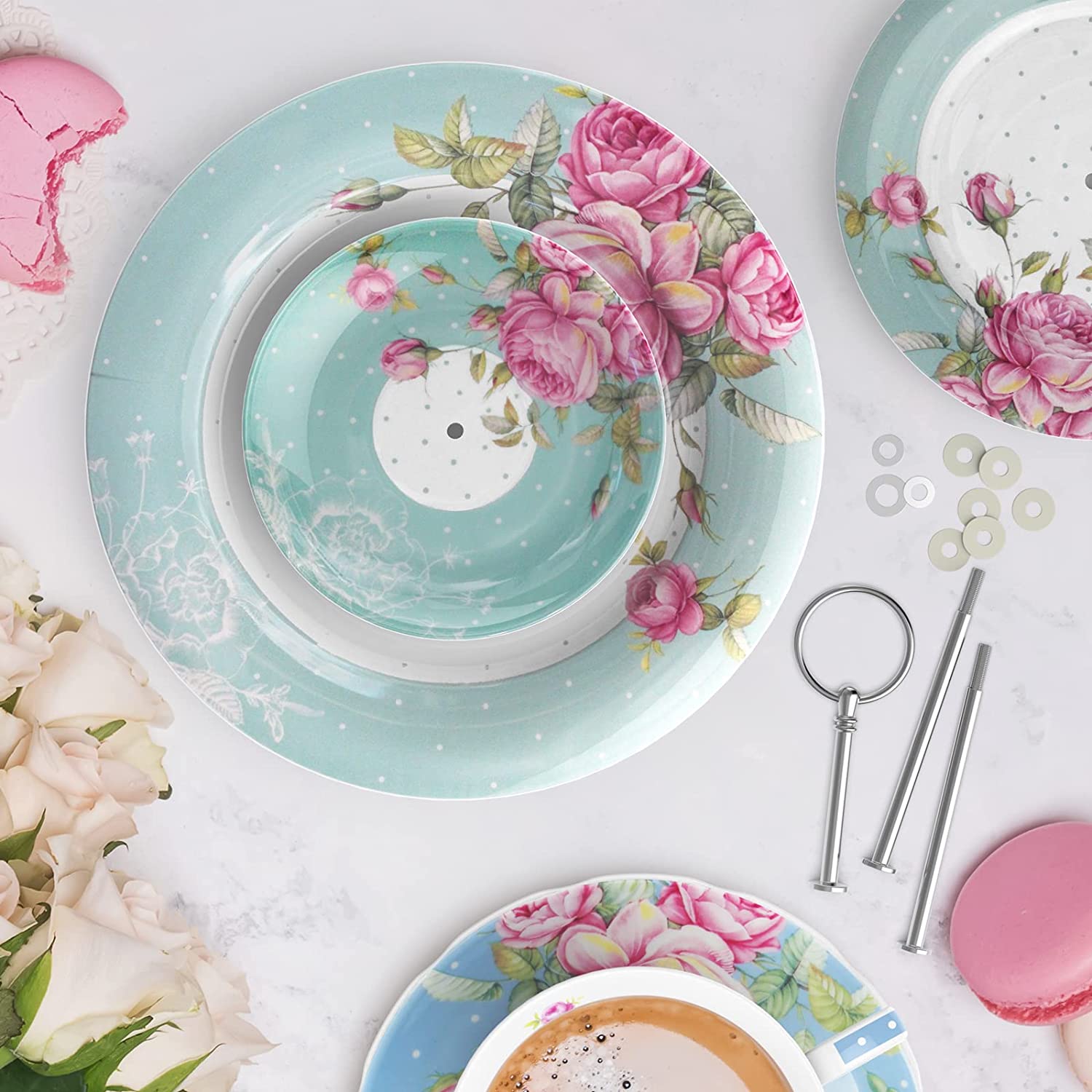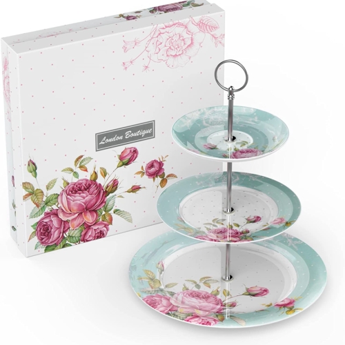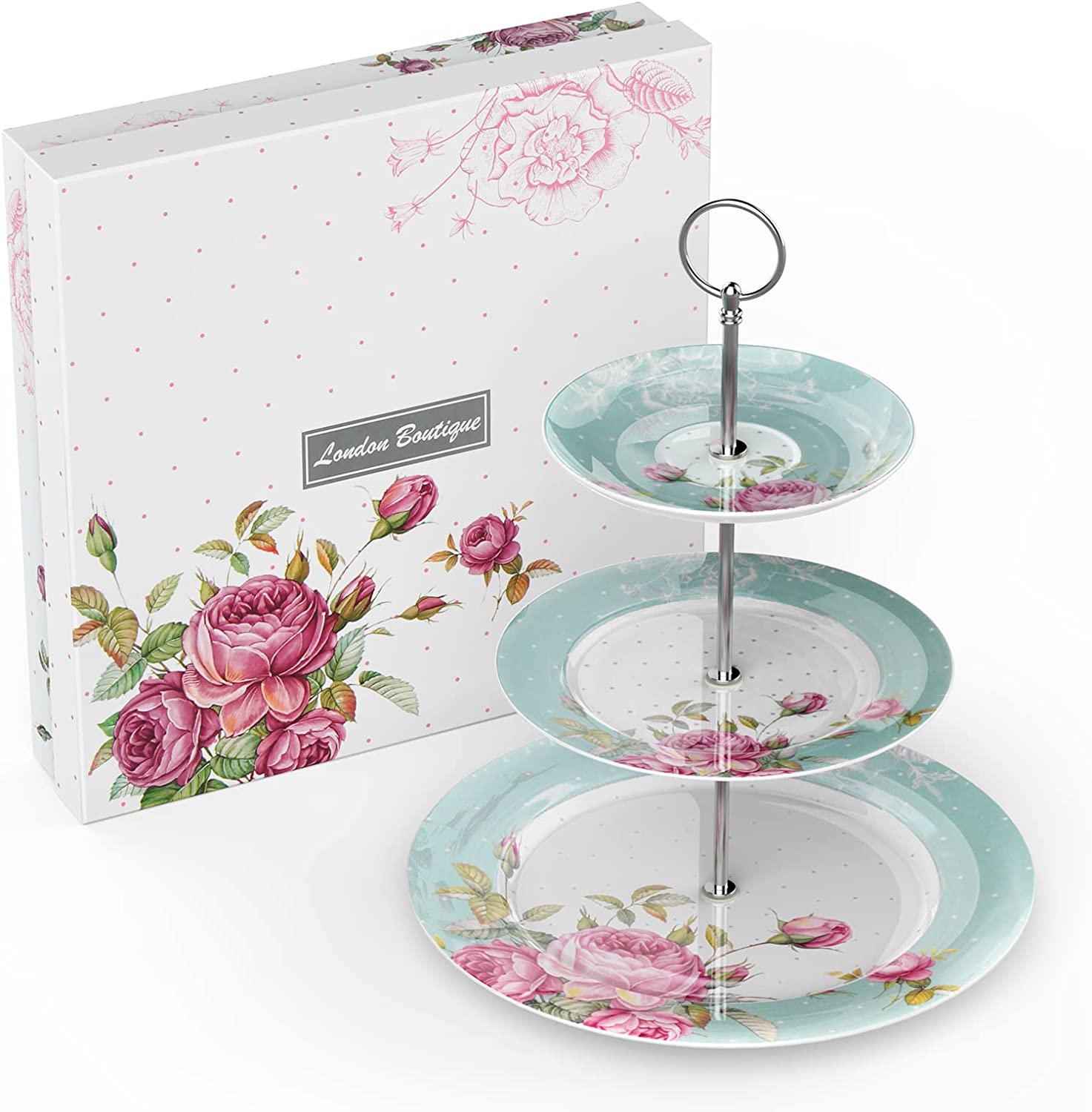 Brand: London BoutiqueColor: TurquoiseFeatures: Premier Qulity — Made with premier quality of porcelain, no animal bone ash, suitable for vegan and vegetarian. Glazed white Chinaware, with vintage shabby chic flora rose design Size — Large 10.7 inches, Medium 7.6inches, Small 6.1 inches; Height of the cake stand is 13 inches. 3 of the plates have a hole in the middle for the fittings; Silver matel fittings with instruction of assembly; 4 Colours: Black, Turquoise, Blue and Pink; Vintage British Shabby Chic design in glazed white china Food Safe — No lead, meet food safety standard. Made with premium qulity of porcelain, no bone ash. Bright white colour give it elegant touch. Perfect Gift — Taylor made gift box matching the design of the cake stand, perfect gift idea for the loved ones, or treat yourself Microwave and Dishwasher safe EAN: 5060777559908