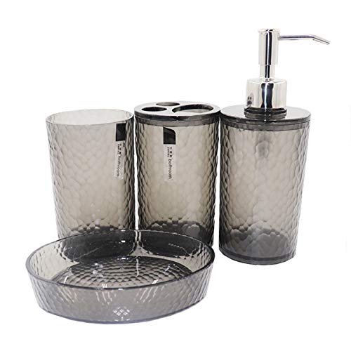 Brand: London BoutiqueColor: Clear BlackFeatures: The bathroom accessory set comes in clear colour, including Soap Dispenser, Toothbrush Holder, Tumbler and Soap dish The bathroom accessory set comes in 3 clear colour, clear black, clear brown and clear white, in a classic shape, suitable for all kind of bathroom. Distinctive handcrafted, Texture Streamlined Design, made of durable plastic, Food grade PP material, clear see through, light weight, classic shape contemporary style Stainless steel pump unscrews easily for refilling and perfect for liquid soap, bath gels, shampoos, conditioners or moisturizing creams and lotions. Size: Soap dispenser: H18*D7.8cm; Soap dish: L13*W13*H3.2cm; Toothbrush Holder and Tumbler: H12.2*D7.5cm Details: The bathroom accessory set comes in clear black, clear brown and clear white colour. They are suitable for any colour theme in your bathroom. The bathroom accessory set will get your bathroom organised, it is suitable for big and small bathrooms. The set are made a high graded strong plastic, give the bathroom a contemporary touch.Package Dimensions: 8.8 x 5.7 x 4.3 inches