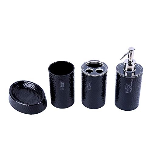 Brand: London BoutiqueColor: BlackFeatures: The bathroom accessory set includes Soap Dispenser, Toothbrush Holder, Tumbler and Soap dish The bathroom accessory set comes in 3 colour, black brown and white, in a classic shape, suitable for all kind of bathrooms. Distinctive handcrafted, Texture Streamlined Design, made of durable plastic, Food grade PP material, clear see through, light weight, classic shape contemporary style Stainless steel pump unscrews easily for refilling and perfect for liquid soap, bath gels, shampoos, conditioners or moisturizing creams and lotions. Size: Soap dispenser: H18*D7.8cm; Soap dish: L13*W13*H3.2cm; Toothbrush Holder and Tumbler: H12.2*D7.5cm Details: The bathroom accessory set comes in clear black, clear brown and clear white colour. They are suitable for any colour theme in your bathroom. The bathroom accessory set will get your bathroom organised, it is suitable for big and small bathrooms. The set are made a high graded strong plastic, give the bathroom a contemporary touch.Package Dimensions: 8.7 x 5.8 x 4.2 inches