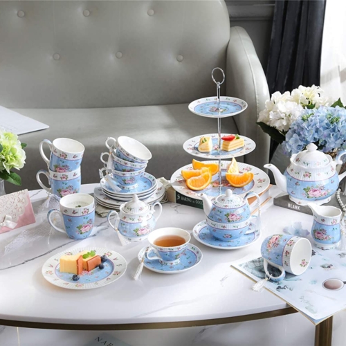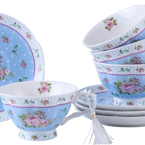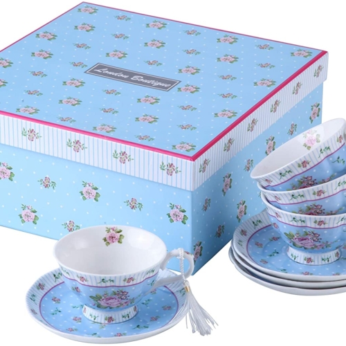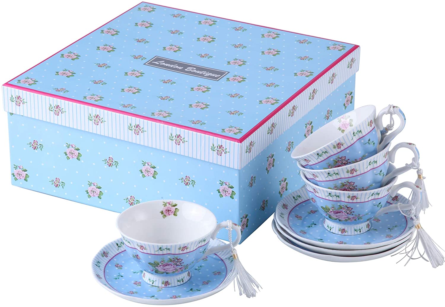 Brand: London Boutique Color: Rose Blue Features: Cups and Saucers set include 4 cups and 4 saucers, Blue, Teal, Beige and Pink 4 colours mixed in one set. Rose Blue, Rose Pink, Butterflies and Bird Rose Butterfly options have 4 teacups and saucers in the same colour. cups and saucers set is in Beautiful gift box, Gift box cups ans saucers match design Capacity of the cup: 220ml, Sizes:Cup Width10 x Depth 7cm, Saucer: Diameter 15cm Cups and Saucers set is made of good quality of porcelain, decrated with touch of beautiful life Binding: Kitchen & Home Release Date: 07-10-2018 Details: This beautiful mug in a gift box, it is perfect gift present. It comes in 2 cups and saucers set. Rose Lavender flower cup and saucers in Beautiful gift box, Gift box cups ans saucers match flower print. microwave and dish washer safe Package Dimensions: 11.4 x 11.4 x 4.9 inches