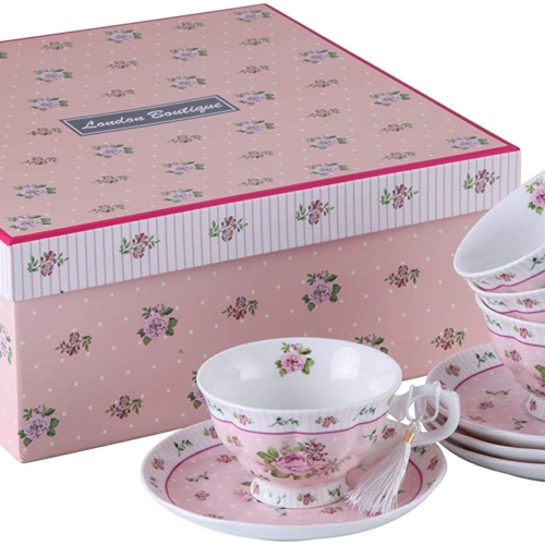 Brand: London Boutique Color: Rose Pink Features: Cups and Saucers set include 4 cups and 4 saucers, Blue, Teal, Beige and Pink 4 colours mixed in one set. Rose Blue, Rose Pink, Butterflies and Bird Rose Butterfly options have 4 teacups and saucers in the same colour. cups and saucers set is in Beautiful gift box, Gift box cups ans saucers match design Capacity of the cup: 220ml, Sizes:Cup Width10 x Depth 7cm, Saucer: Diameter 15cm Cups and Saucers set is made of good quality of porcelain, decrated with touch of beautiful life Binding: Kitchen & Home Release Date: 07-10-2018 Details: This beautiful mug in a gift box, it is perfect gift present. It comes in 2 cups and saucers set. Rose Lavender flower cup and saucers in Beautiful gift box, Gift box cups ans saucers match flower print. microwave and dish washer safe Package Dimensions: 12.4 x 12.0 x 5.9 inches
