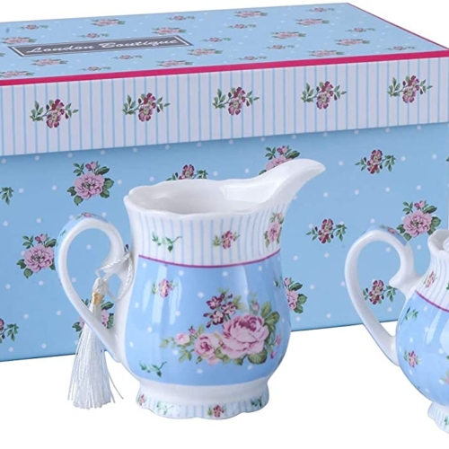 Brand: London Boutique Color: Cream & Sugar Set Rose Blue Features: Teapot sets come as 1 teapot with lid, 1 sugar bowl with lid and 1 Cream Milk Jug Teapot with build in filter at end of the sprout, suitable for loose tea. Teapot Sugar Bowl and Cream Milk Jug in white colour with shabby chic vintage design in blue and pink colour. Teapot sugar Bowl and Milk Jug can be used separatly, in a same design lovely gift box, ideal for gift and present Capacity of the Teapot 800ML. Size of the teapot: H13cm,diamater on top is 9cm. Binding: Kitchen & Home