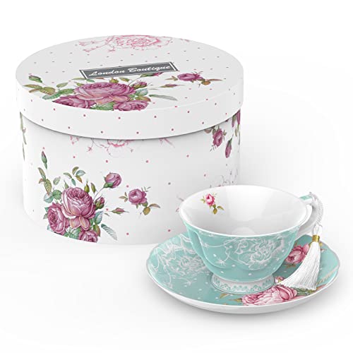 Brand: London BoutiqueColor: TurquoiseFeatures: The Package: 1 teacup, 1 saucer and a gift box; Vintage British Shabby Chic design in glazed white china Size and Capacity — Cup: 200ml 7oz, 5×2.4inches; Saucer: 15.5cm 6inches Food Safe — No lead, meet food safety standard. Made with premium quality of porcelain, no bone ash. Bright white colour give it elegant touch. Perfect Gift — Taylor made gift box matching the design of the teacup and saucer set, perfect gift idea for the loved ones, or treat for yourself Premier Quality — Made with premier quality of porcelain, no animal bone ash, suitable for vegan and vegetarian. Glazed white Chinaware, with vintage shabby chic flora rose design; Microwave and Dishwasher safe Binding: Kitchen & HomeEAN: 5060777559816