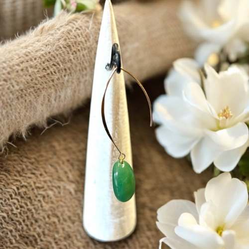 Long drop earrings with emerald colour stone and gold hook ER171GGThe earrings are long drop style, featuring a prominent, deep emerald-coloured stone as the focal point. The stone is oval-cut, with a rich, vivid green hue, faceted to catch the light from multiple angles.on.