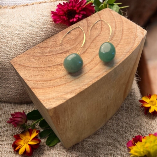 Long drop earrings with emerald colour stone and gold hook ER171GGThe earrings are long drop style, featuring a prominent, deep emerald-coloured stone as the focal point. The stone is oval-cut, with a rich, vivid green hue, faceted to catch the light from multiple angles.on.