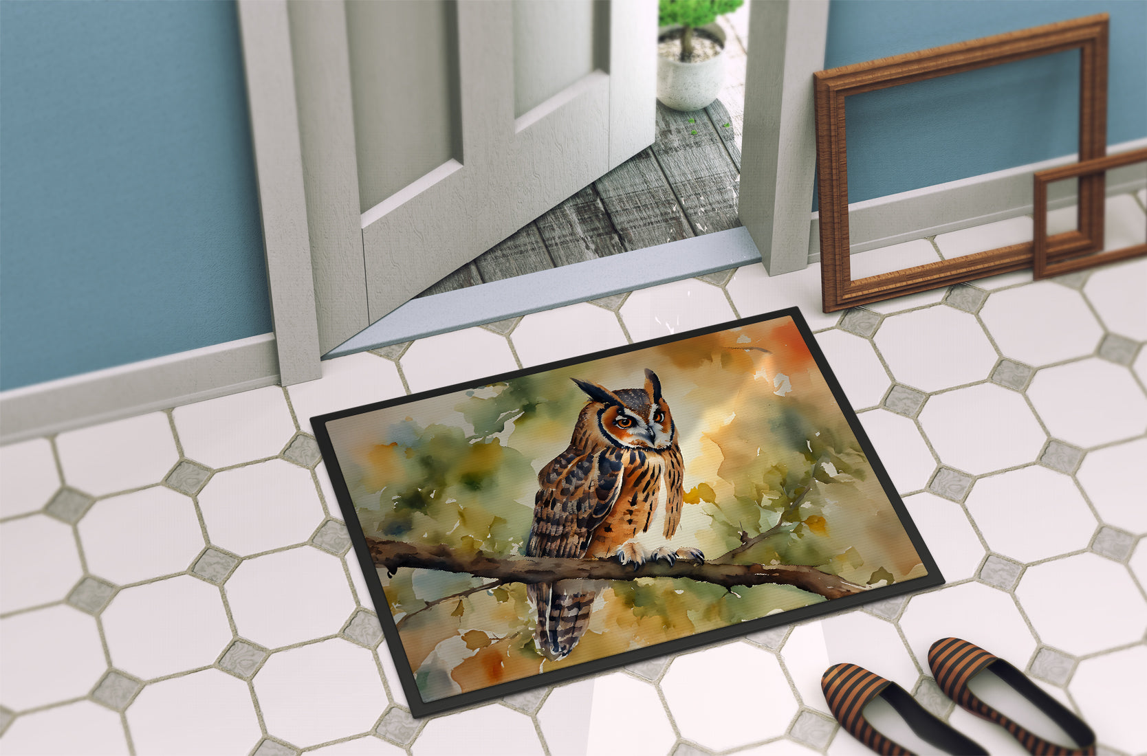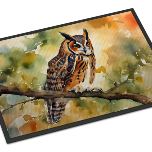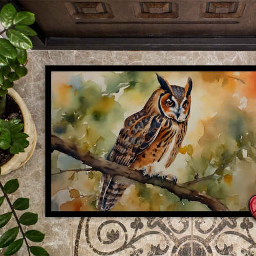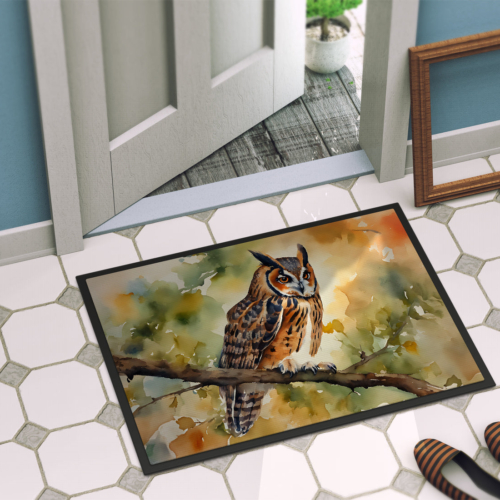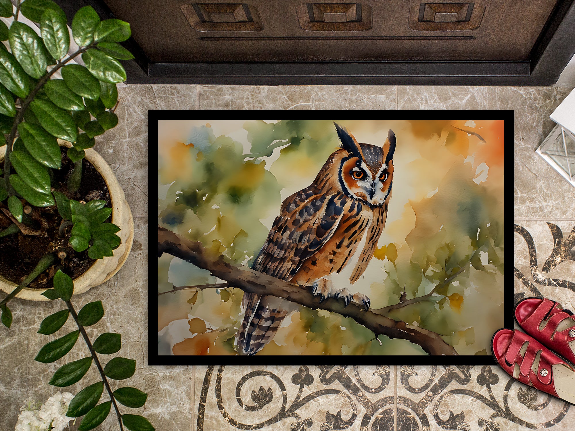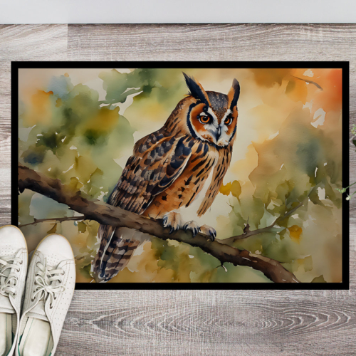 Doormat featuring breed specific Long-Eared Owl artwork. Welcome your guests in style with our Artwork Door Mat, designed to withstand almost any weather condition. This mat, measuring approximately 18 by 27 inches, is held together by durable black binding tape. Its top layer, composed of polyester felt, is dyed with the eye-catching image you see on the mat. A few layers below provide the mat with stability, while its rubber bottom is stamped to help prevent slipping and ensures safety. Our mat works wonderfully as both an indoor or outdoor door mat. For cleaning, simply hose it off with water or use a power washer – no need for any cleaner that produces suds. Avoid scrubbing with a brush, instead, opt for the vacuum on floor setting. Designed manufactured and printed in the USA, this mat is a perfect addition to your porch, outdoor kitchen, entryway, or any indoor space. Its unique design makes it a charming decorative rug that greets your guests and adds a stylish touch to your home decor.