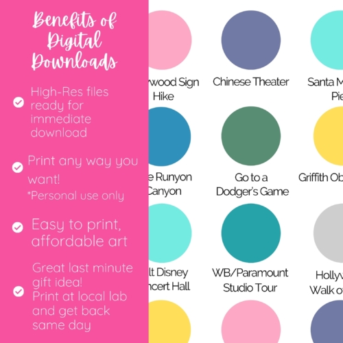 Embarking on an adventure to the vibrant city of Los Angeles? Your ultimate travel planner awaits with this Los Angeles bucket list printable art! Discover the top must-see destinations across Los Angeles, California, all in one convenient digital download. From iconic landmarks to hidden gems, this travel checklist has you covered. Simplify your trip planning with this travel itinerary and make the most of your time exploring all the incredible things to do in Los Angeles. This travel bucket list digital download features 2 files, available for instant download after purchase. Then print and use on your vacation!! ☀️ Start planning your Los Angeles adventure and check off as many experiences as possible from this bucket list! *THIS IS A DIGITAL DOWNLOAD IMAGE. NO PHYSICAL ITEM WILL BE SHIPPED*Benefits of digital prints:• Print at home, at your local print shop, or online and have them shipped right to your door!• Save time and money on shipping• Style and personalize your home or office just the way you want• Great last minute gift idea• Stop waiting for shipping – these files are ready to download immediately!————————————FILES YOU’LL RECIEVE(2) 8×10 inch jpg file————————————• All of the files included in this download are for PERSONAL USE ONLY and may not be shared, forwarded, sold, or otherwise distributed. This file may not be altered in any way except for cropping to fit your needs. Commercial use is prohibited.• Colors may vary between monitors and printers.**NOTE: ALL SALES ON DIGITAL DOWNLOADS ARE FINAL*** HOW TO DOWNLOAD* Digital Download will be automatically emailed to you upon purchase. Please allow a few minutes for the email to arrive. If they aren’t delivered within an hour, please check your spam folder and contact me with any problems or questions.