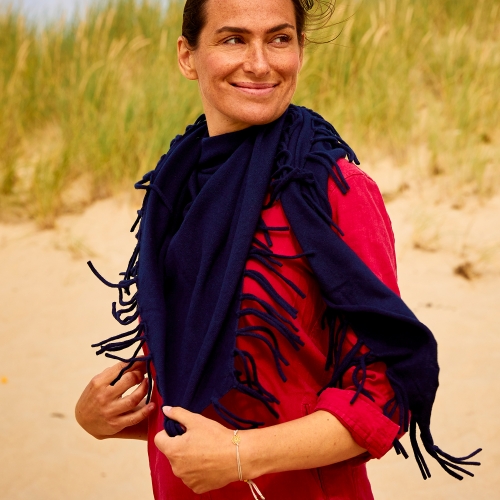 This cashmere triangle with long fringes is a special accessory. Worn over the shoulder, it is a real highlight that gives your look a very personal touch.