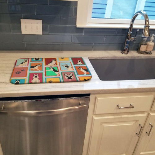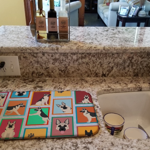 Dish Drying Mat featuring breed specific German Shepherd artwork. Say goodbye to messy countertops and soggy dish towels with our innovative dish drying mat. Our high-quality dish drying pad is designed to keep your countertops dry while offering a stylish and efficient solution. Whether you’re air drying dishes, glasses, stemware, silverware, pots, pans, bottles, or even fruits and vegetables, our dish mat is the perfect choice. The 14 inches x 22 inches size fits most counters and dish drying racks, and the non-slip design ensures stability. Made with water-absorbent polyester and a polyurethane foam insert, our dish drying mat is not only functional but also durable. It’s machine washable and printed in the USA for long-lasting use. The beautiful artwork adds flair to your kitchen decor, making it a perfect housewarming gift or present for any occasion. Upgrade your kitchen experience with our absorbent and versatile dish drying mat.