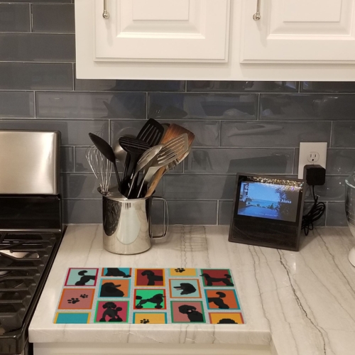 Glass Cutting Board featuring breed specific Poodle artwork. Introduce your kitchen to the vibrant, large Decorative Glass Cutting Board from Caroline’s Treasures. Crafted from resilient tempered glass, this board is not only a utilitarian necessity but also a colorful art piece. With its generous dimensions of 15 inches in height and 12 inches in length, it offers ample space for all your cutting needs. Every piece showcases captivating artwork from distinguished artists, bringing an aesthetic edge to your kitchen. Beyond its attractive design, this cutting board ensures your countertop stays pristine and unscathed, owing to its heat-resistant properties. Engineered with user convenience in mind, it features non-skid feet for stability, and rounded corners for additional safety. Its robust construction renders it virtually unbreakable, guaranteeing longevity. The board comes with protective feet bumpers, maintaining its position during use. This product is recommended to be hand washed only. Proudly printed and assembled in the United States, this cutting board exemplifies superior craftsmanship. With Caroline’s Treasures’ Decorative Glass Cutting Board, you’re investing in a blend of functionality and artistic flair.