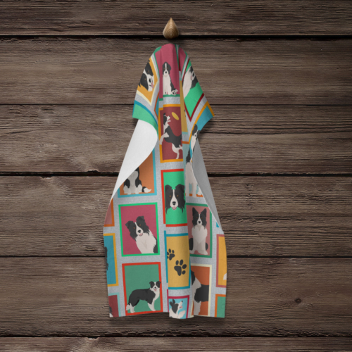 Kitchen Towel featuring breed specific Border Collie artwork. Experience the perfect blend of aesthetic appeal and functional excellence with our Plush Velour Kitchen Towels. These are not your ordinary decorative kitchen towels that gather dust. Instead, they are designed to be as practical as they are stylish. The front layer of our towel is constructed from a minky plush polyester, known for its durability and color retention. Unlike conventional kitchen towels, the artwork on our towels is dyed directly into the fabric, ensuring vibrant colors that last. Polish your glassware to a brilliant sparkle using the plush front side of the towel. Flip to the back, crafted from 100% cotton terry loop, to exploit its exceptional absorbency for drying dishes or wiping down counters. Our kitchen towels redefine the concept of functional art, offering lasting quality that maintains the towel’s shape over time. Measuring 15 inches by 25 inches and weighing 2.3 lbs per dozen, these towels deliver an overwhelming sensory experience with their soft, plush, and smooth texture. The edges are meticulously finished with binding, enhancing their durability and visual appeal. For your convenience, these towels are machine washable and can be dried on low heat. After the first wash, the top fabric becomes even softer and fluffier, eliminating the need for ironing. Treat your kitchen to the luxury and functionality it deserves with our plush velour kitchen towels.