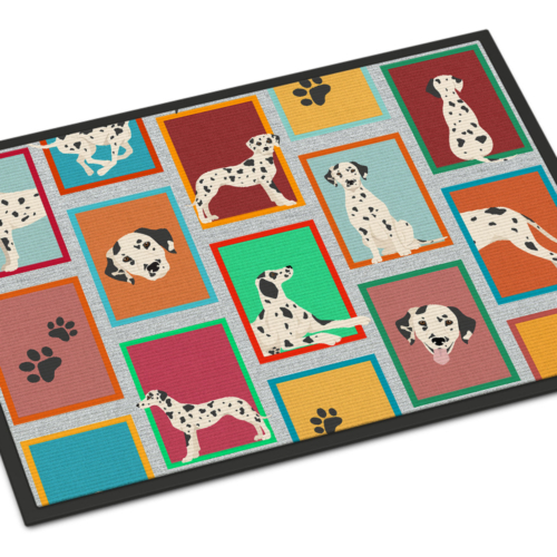 Doormat featuring breed specific Dalmatian artwork. Welcome your guests in style with our Artwork Door Mat, designed to withstand almost any weather condition. This mat, measuring approximately 24 by 36 inches, is held together by durable black binding tape. Its top layer, composed of polyester felt, is dyed with the eye-catching image you see on the mat. A few layers below provide the mat with stability, while its rubber bottom is stamped to help prevent slipping and ensures safety. Our mat works wonderfully as both an indoor or outdoor door mat. For cleaning, simply hose it off with water or use a power washer – no need for any cleaner that produces suds. Avoid scrubbing with a brush, instead, opt for the vacuum on floor setting. Designed manufactured and printed in the USA, this mat is a perfect addition to your porch, outdoor kitchen, entryway, or any indoor space. Its unique design makes it a charming decorative rug that greets your guests and adds a stylish touch to your home decor.