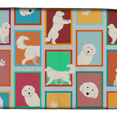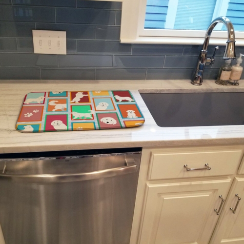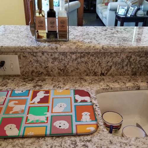Dish Drying Mat featuring breed specific Great Pyrenees artwork. Say goodbye to messy countertops and soggy dish towels with our innovative dish drying mat. Our high-quality dish drying pad is designed to keep your countertops dry while offering a stylish and efficient solution. Whether you’re air drying dishes, glasses, stemware, silverware, pots, pans, bottles, or even fruits and vegetables, our dish mat is the perfect choice. The 14 inches x 22 inches size fits most counters and dish drying racks, and the non-slip design ensures stability. Made with water-absorbent polyester and a polyurethane foam insert, our dish drying mat is not only functional but also durable. It’s machine washable and printed in the USA for long-lasting use. The beautiful artwork adds flair to your kitchen decor, making it a perfect housewarming gift or present for any occasion. Upgrade your kitchen experience with our absorbent and versatile dish drying mat.