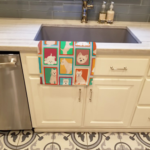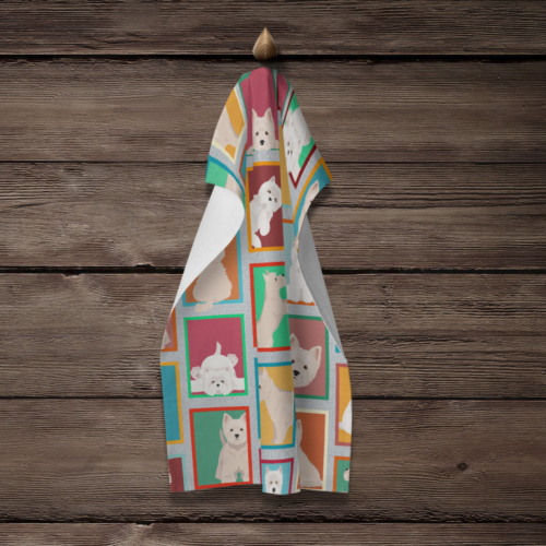 Kitchen Towel featuring breed specific Westie artwork. Experience the perfect blend of aesthetic appeal and functional excellence with our Plush Velour Kitchen Towels. These are not your ordinary decorative kitchen towels that gather dust. Instead, they are designed to be as practical as they are stylish. The front layer of our towel is constructed from a minky plush polyester, known for its durability and color retention. Unlike conventional kitchen towels, the artwork on our towels is dyed directly into the fabric, ensuring vibrant colors that last. Polish your glassware to a brilliant sparkle using the plush front side of the towel. Flip to the back, crafted from 100% cotton terry loop, to exploit its exceptional absorbency for drying dishes or wiping down counters. Our kitchen towels redefine the concept of functional art, offering lasting quality that maintains the towel’s shape over time. Measuring 15 inches by 25 inches and weighing 2.3 lbs per dozen, these towels deliver an overwhelming sensory experience with their soft, plush, and smooth texture. The edges are meticulously finished with binding, enhancing their durability and visual appeal. For your convenience, these towels are machine washable and can be dried on low heat. After the first wash, the top fabric becomes even softer and fluffier, eliminating the need for ironing. Treat your kitchen to the luxury and functionality it deserves with our plush velour kitchen towels.