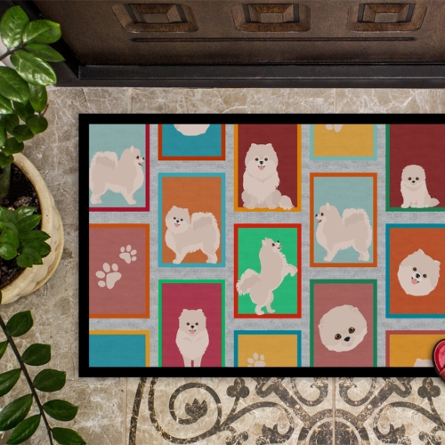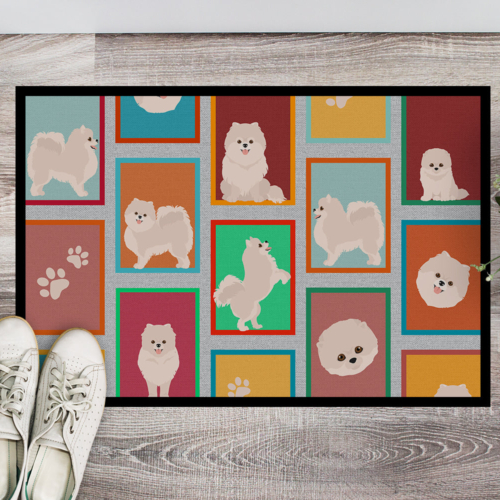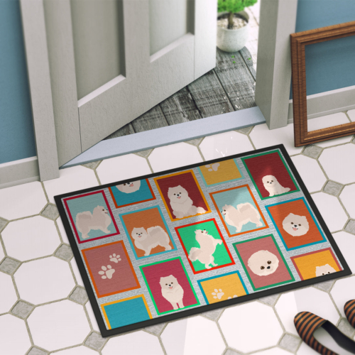 Doormat featuring breed specific Pomeranian artwork. Welcome your guests in style with our Artwork Door Mat, designed to withstand almost any weather condition. This mat, measuring approximately 24 by 36 inches, is held together by durable black binding tape. Its top layer, composed of polyester felt, is dyed with the eye-catching image you see on the mat. A few layers below provide the mat with stability, while its rubber bottom is stamped to help prevent slipping and ensures safety. Our mat works wonderfully as both an indoor or outdoor door mat. For cleaning, simply hose it off with water or use a power washer – no need for any cleaner that produces suds. Avoid scrubbing with a brush, instead, opt for the vacuum on floor setting. Designed manufactured and printed in the USA, this mat is a perfect addition to your porch, outdoor kitchen, entryway, or any indoor space. Its unique design makes it a charming decorative rug that greets your guests and adds a stylish touch to your home decor.