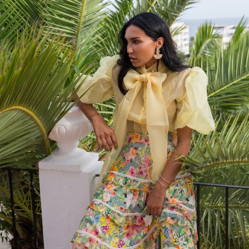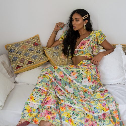 The Lowri skirt is a detailed gypsy style maxi skirt with tier upon tier of floral frills . A small white crochet trim adds to the boho styling. With side hook and eye fastening and concealed zip in side seam.