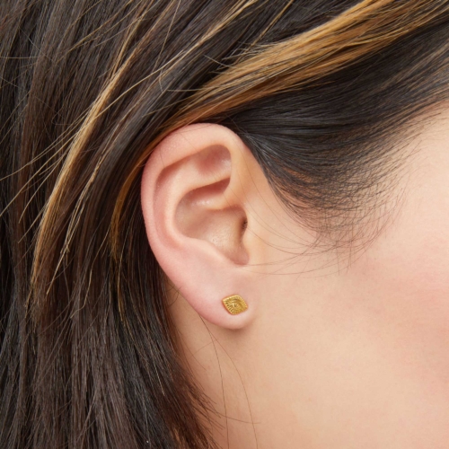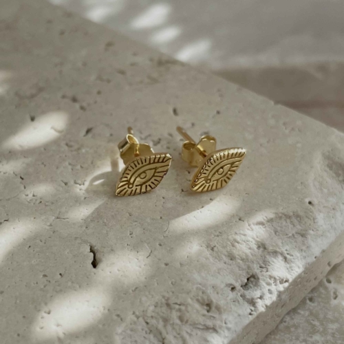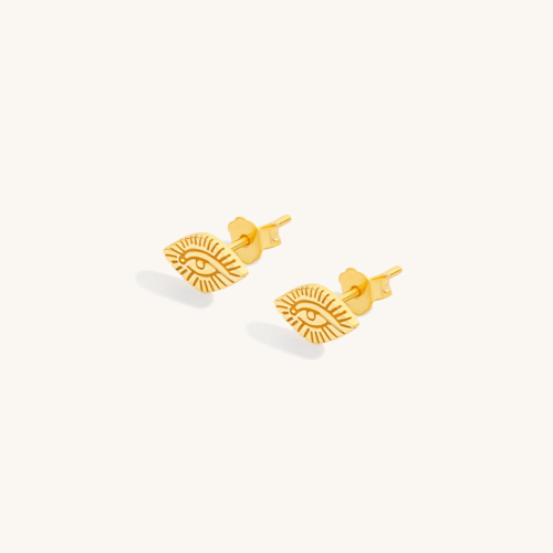 The Evil Eye symbol is an age old talisman designed to ward off bad vibes and evil spirits. Protect yourself from negative energy all day long by wearing these hand carved delicate studs. Perfect paired with a classic hoop. MATERIALS : 18k gold plated silver SIZING : 8mm stud, 10mm post length MEANING : Evil Eye – projects positivity and inner power to ward off evil intentions