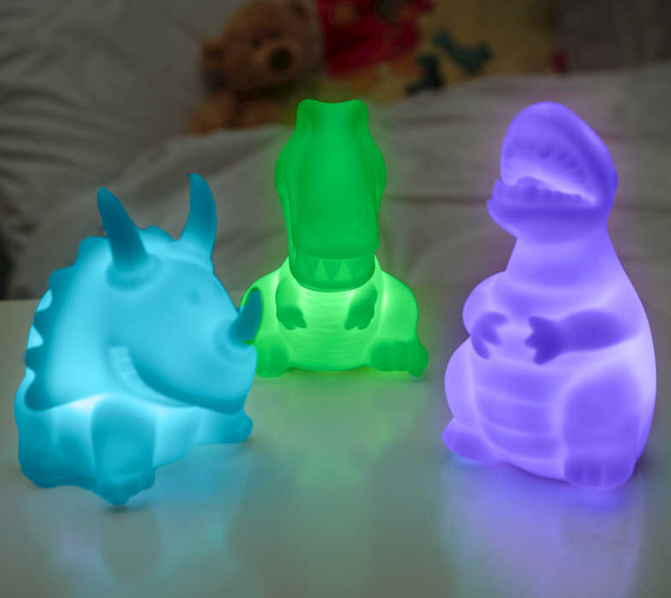 Pack of three light-up dinosaurs that change colour as they glow. The set includes a t-rex, triceratops and an allosaurus, all of them with cute cartoon-like features. Just flick the switch on the base of each dinosaur and their white exterior will illuminate, starting with red before gradually phasing through a range of greens, blues and purples. They make a fantastic set of alternative night lights and as you get three in a pack, can be placed in several locations around a room. Pack of three dinosaur lights T-rex, triceratops and allosaurus White exterior with cute cartoon-like features Flick switch to illuminate Phases between red, blue and green colours Great alternative night lights Batteries included Tallest dinosaur 10cm