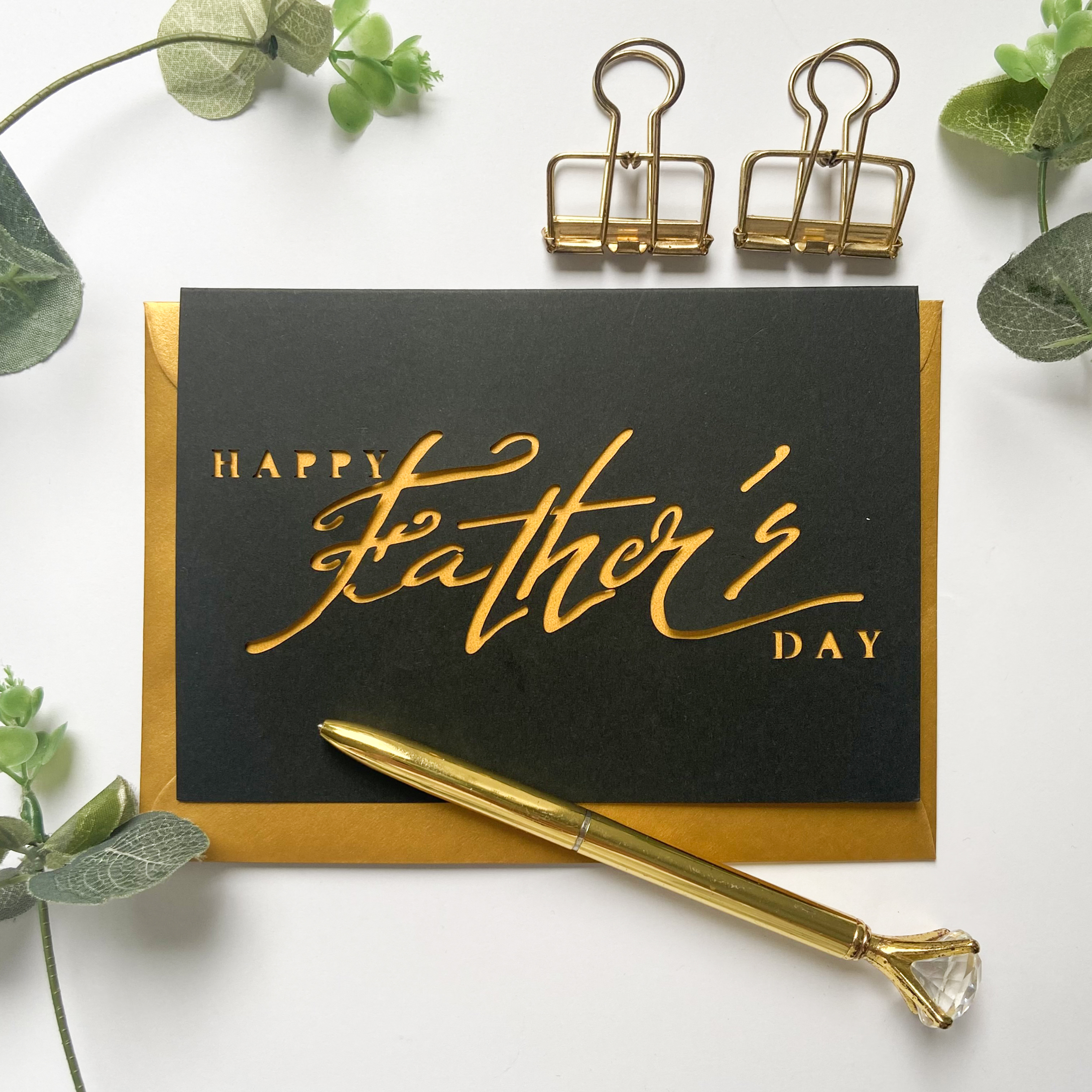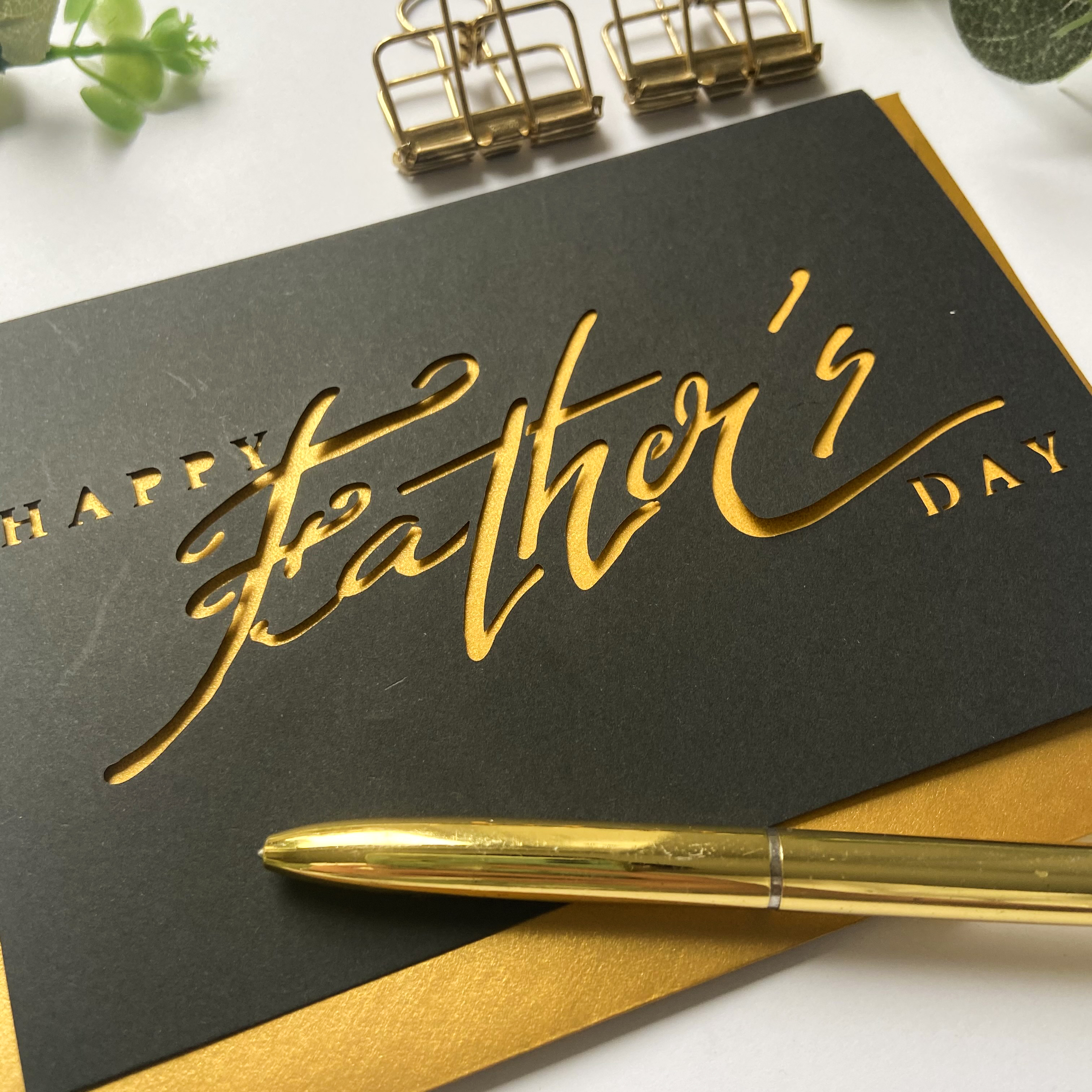 Make Father’s day extra special with this minimal. yet striking design. The card features the text “Happy Father’s day” in free style calligraphy- the black paper stock is both daring and luxe.