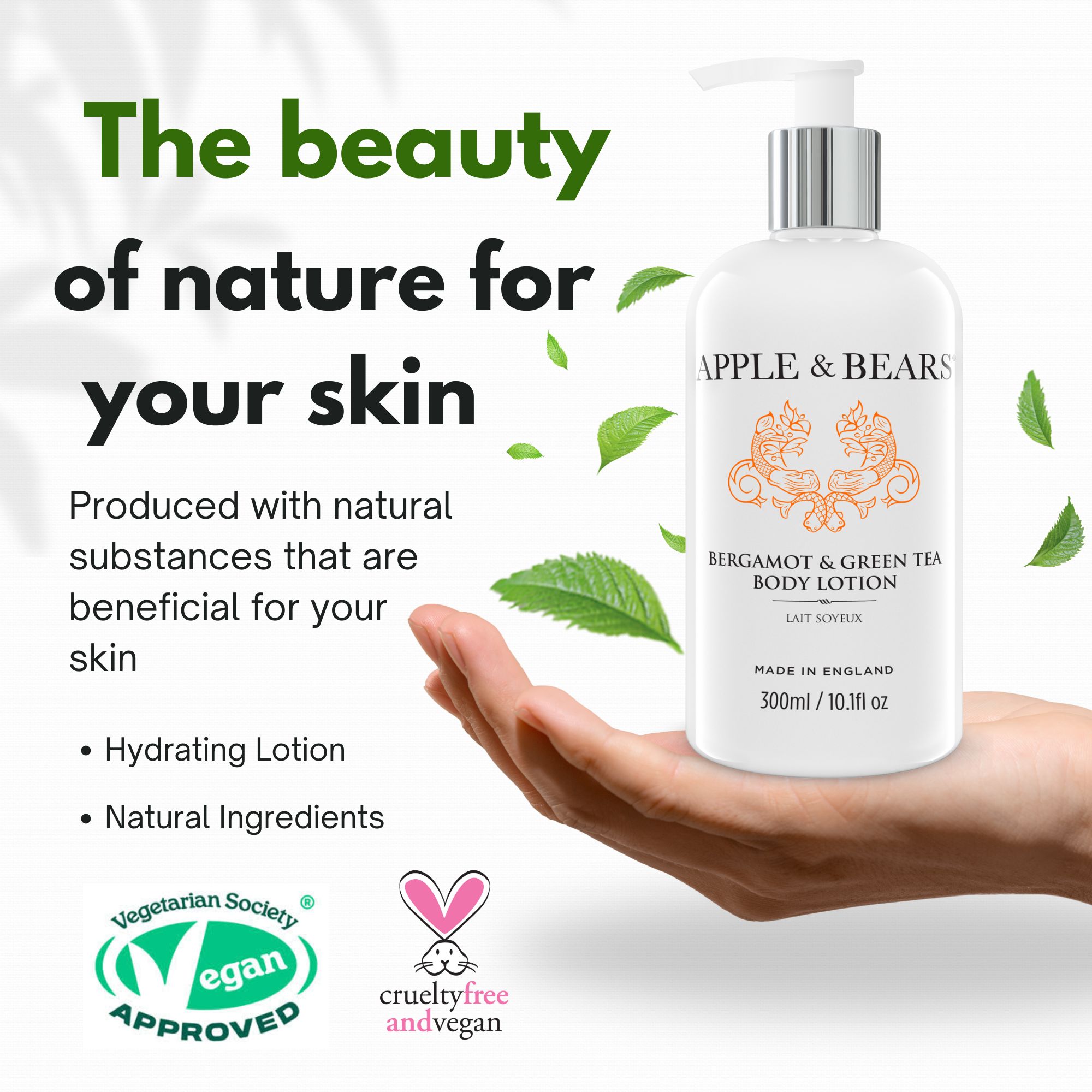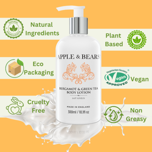– PETA Cruelty Certified & Vegetarian Society Approved: At Apple & Bear, we believe that ethics and great aesthetics can coexist. The Vegetarian Society has certified our body lotion, Bergamot & Green Tea, which is 100% vegan and available in Chicago, IL.
