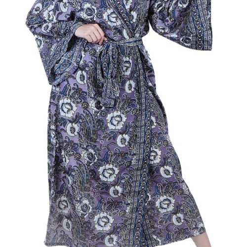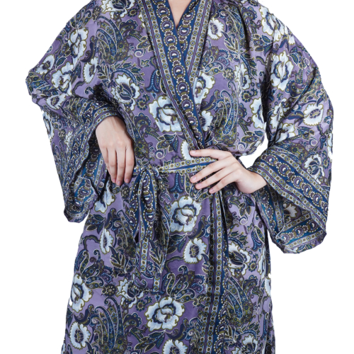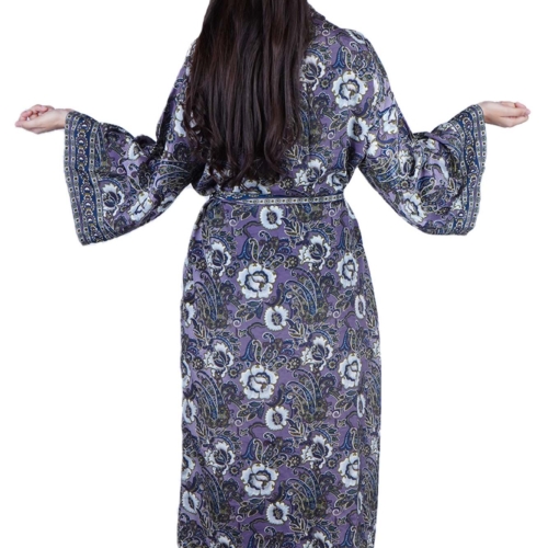 Luxury Satin Boho Kimono House Robe – Purple Blue Floral