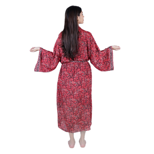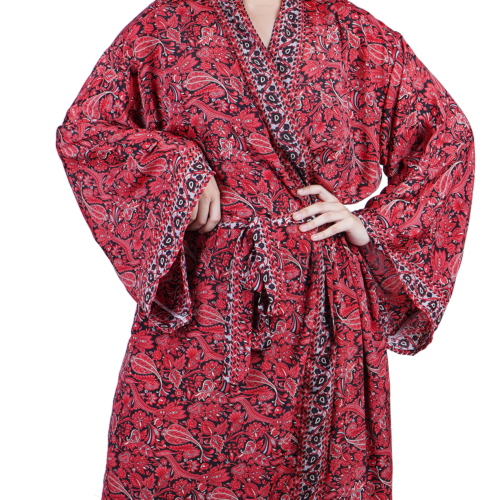 Luxury Satin Boho Kimono House Robe – Red Black Floral