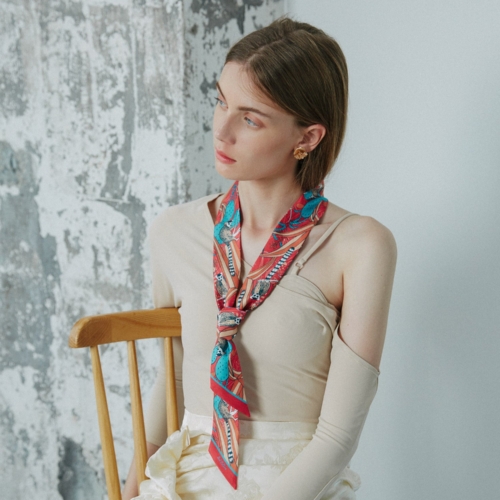 Inspired by the vibrant landscapes and rich cultural heritage of Madagascar, this silk skinny scarf is a statement of bold elegance. The intricate patterns evoke a sense of adventure and artistry, with earthy tones and vivid contrasts bringing warmth and character to any outfit. Whether worn casually or as a refined accent, this scarf adds a touch of effortless sophistication. Product Description Material: 100% Mulberry Silk Size: 120cm x 5cm (Approx. 47″L x 2″W) Design: Double-sided with complementary patterns for versatile styling Color Palette: A fusion of warm terracotta, deep blues, and tribal-inspired motifs How to Wear a Silk Skinny Scarf Neck Scarf: Tie it elegantly around your neck for a polished look. Hair Accessory: Style as a headband or tie around a ponytail for a chic touch. Top Accent: Wear under a collared shirt or drape over a blouse for a refined detail. Bag Decoration: Wrap around your handbag for a pop of color and personality. Waist Belt: Cinch at the waist over a dress or high-waisted trousers. Creative Expression: Explore endless styling possibilities to match your unique fashion sense.