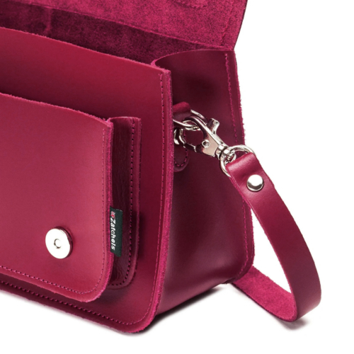 This classic micro satchel is handmade from real leather with cable stitching and nickel silver buckles covering concealed magnetic quick open fastenings. A mini version of our classic satchel in a Magenta / Raspberry pink. For most larger smartphones we recommend the larger Micro Satchel Plus. Available in Small & Plus size. The strap is adjustable and detachable allowing the bag to be worn on your shoulder, cross body or carried as a clutch. Our classic collection is handmade in England from the finest quality leather; this cute bag is just a must-have for those looking for something a little more special and fun. Model is wearing the Magenta Micro Satchel Plus.