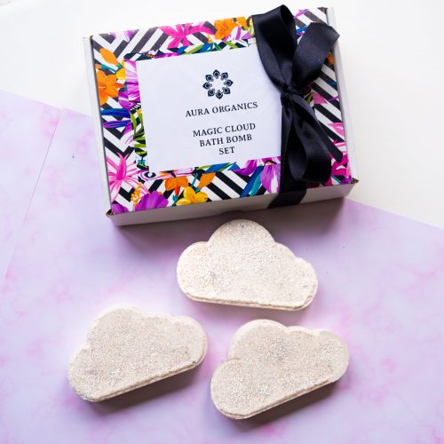 Set of three cloud shaped bath bombs. Scented with natural mango, coconut and strawberry extracts. When dropped in the bath expect a tropical explosion of scent and colour. Topped off with a sparkle of biodegradable glitter.