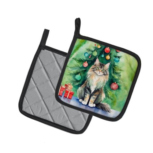 Pair of Pot Holders featuring breed specific MaineCoon artwork. Celebrate Christmas with this Christmas Pair of Pot Holders. A Pair of Pot Holders to match your kitchen decor. Made in the USA these are thick and functional. Full color artwork decorates the front polyester fabric of the hot pad and accented by a black trim. Use these at as a trivet for your Thanksgiving or Christmas tablescape. Filled with insulated fabric and quilted for durability. These colorful pot holders will make a great gift for your favorite home cook or executive chef. Each pot holder measures approximately 7 1/2 inches by 7 1/2 inches. A hanging tab is included.