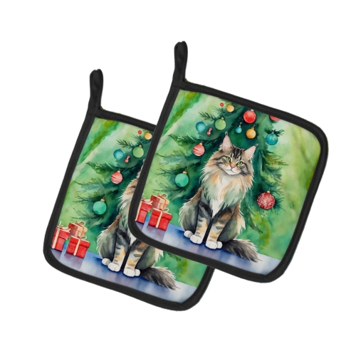 Pair of Pot Holders featuring breed specific MaineCoon artwork. Celebrate Christmas with this Christmas Pair of Pot Holders. A Pair of Pot Holders to match your kitchen decor. Made in the USA these are thick and functional. Full color artwork decorates the front polyester fabric of the hot pad and accented by a black trim. Use these at as a trivet for your Thanksgiving or Christmas tablescape. Filled with insulated fabric and quilted for durability. These colorful pot holders will make a great gift for your favorite home cook or executive chef. Each pot holder measures approximately 7 1/2 inches by 7 1/2 inches. A hanging tab is included.
