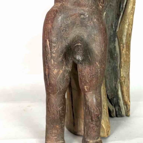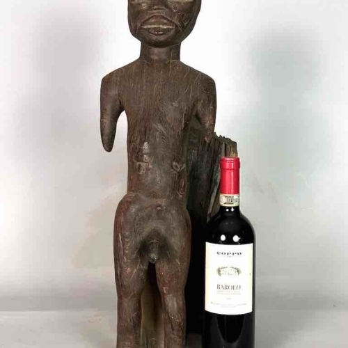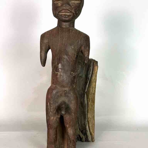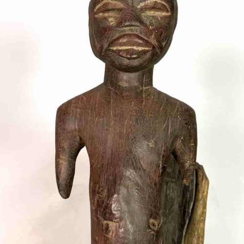 This authentic statue represents the spirit of a male ancestor. This figure was kept in a personal shrine where family members could give offerings, or seek advice for the future. Having been held, handled for many years, the surface of the object is smooth and has lost some detail in the arms. It is also no longer able to stand on its own, but would have been supported in the shrine it was kept in. This figure measures:4 1/2 x 6 1/2 x 22 1/2″ (11 x 17 x 57 cm)