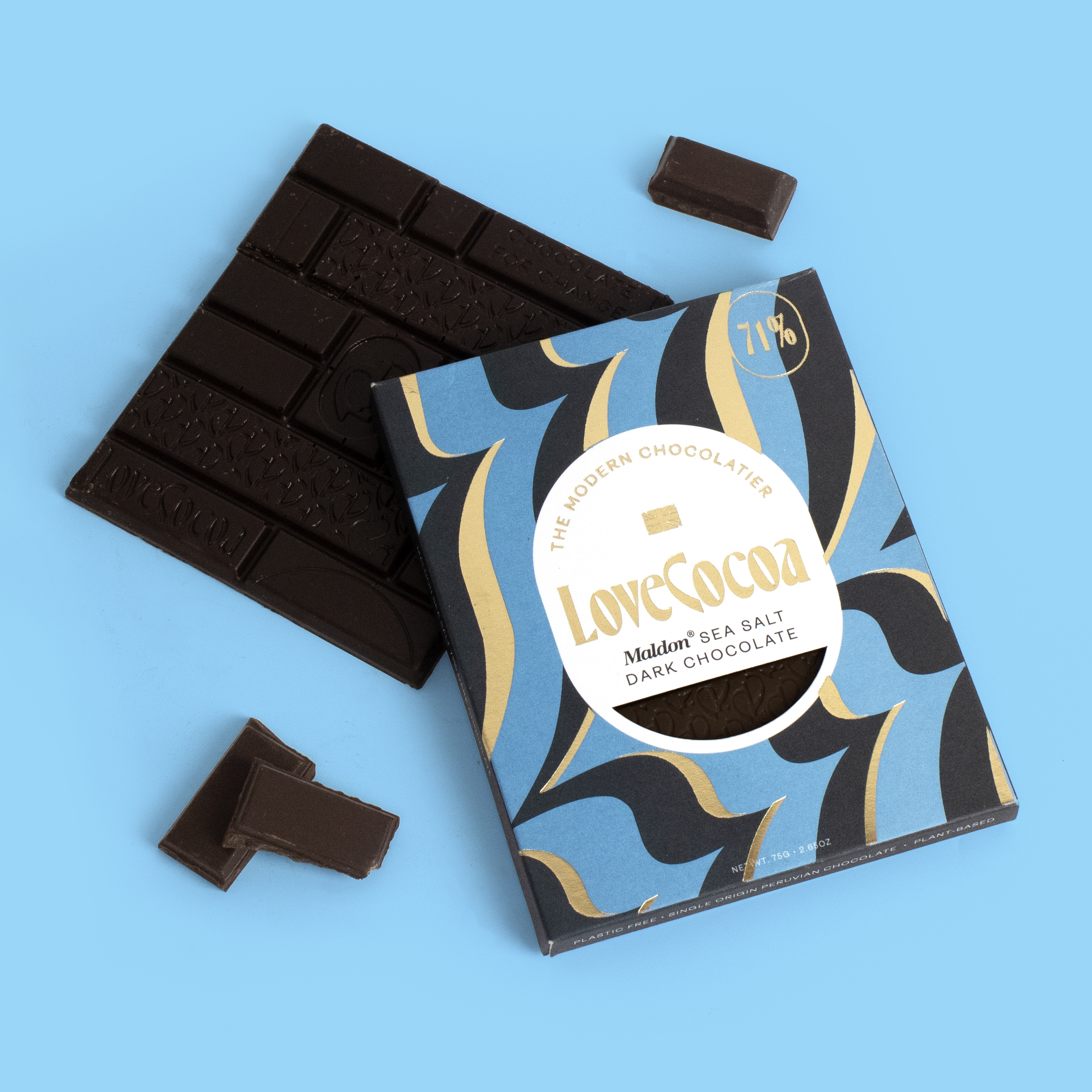 Hand-harvested crunchy Sea Salt flakes bring out the flavours of Peruvian 70% cacao dark chocolate. Make your taste buds dance! A delight with every mouthful, a contemporary British flavour from Love Cocoa by James Cadbury.