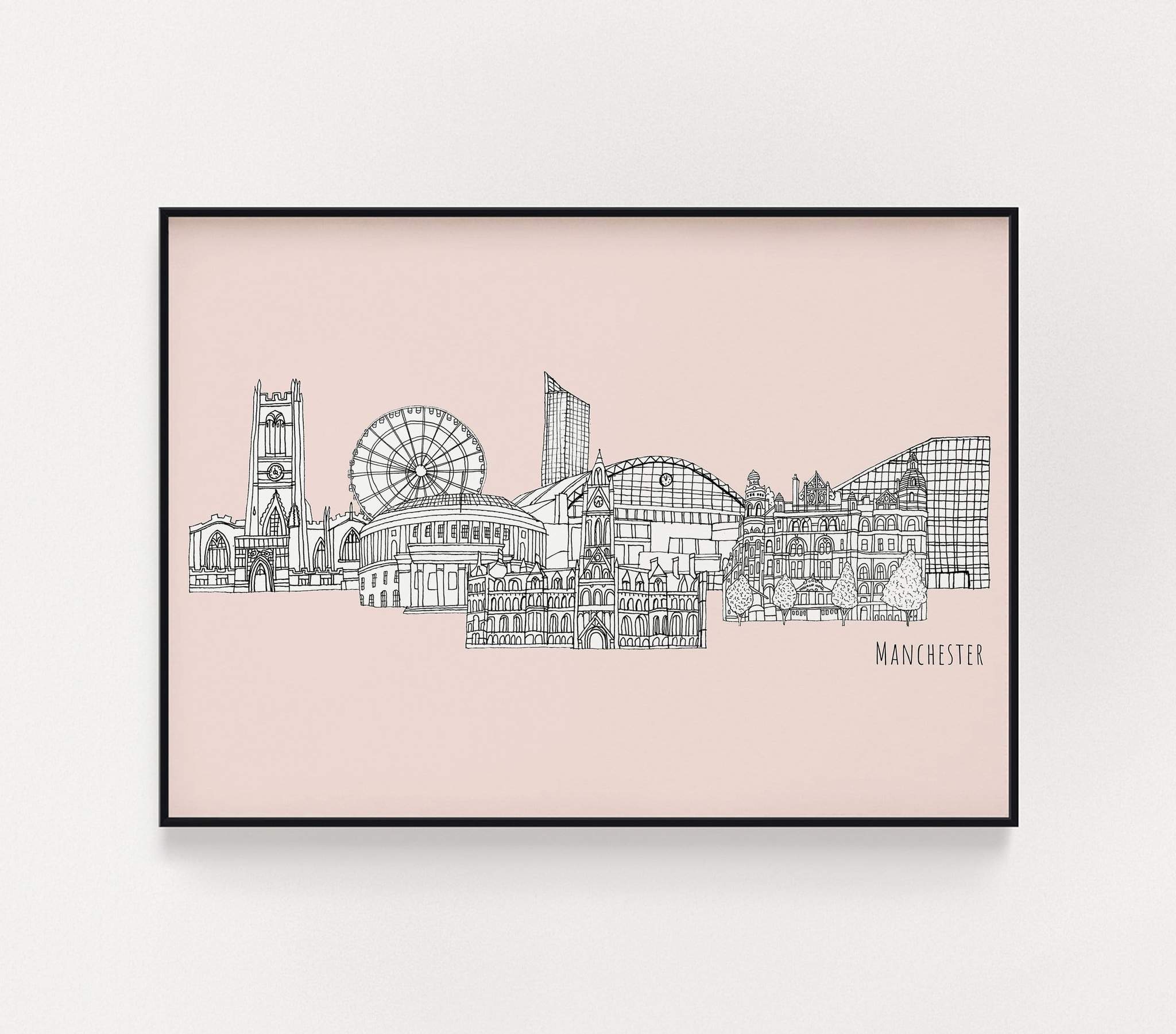 This design was firstly hand drawn then a blush pink background was added digitally to create a simplistic yet contemporary style. This piece includes the following iconic landmarks across Manchester: the Town Hall, Central Library, Manchester Cathedral, The Midland Hotel, Picadilly wheel, the GMEX, Beetham Tower and the Urbis. This makes a lovely gift for somebody moving to or from Manchester!