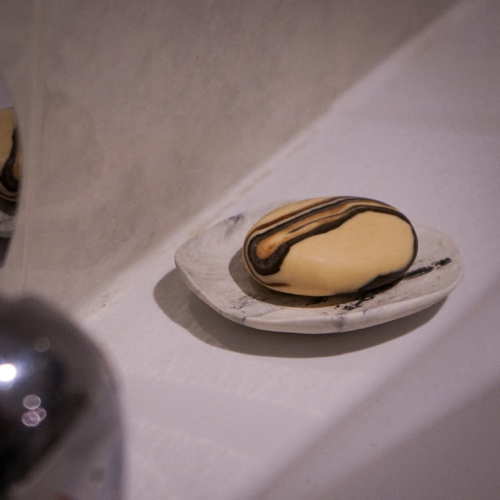 Crafted from porcelain and featuring a marble effect design, this handmade soap dish will complement the beauty of any pebble soap. Each one is carefully hand-thrown, ensuring a unique variation from the product image.