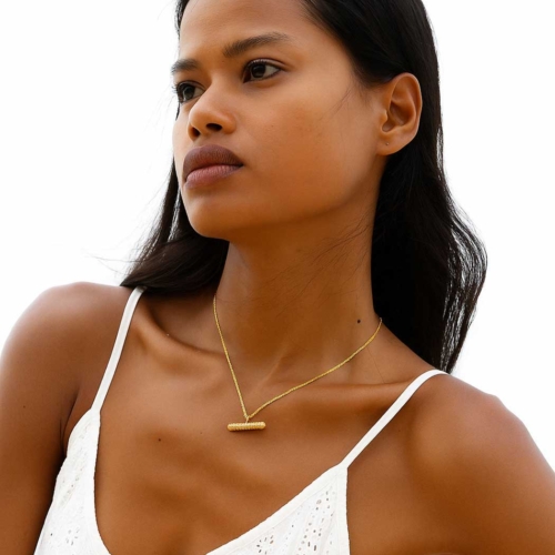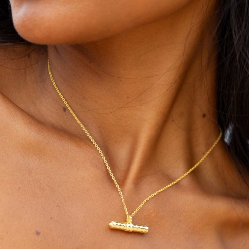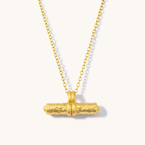 Timeless with a twist. This necklace brings classic energy with our signature Fco texture – think vintage heirloom, reimagined. The delicate gold chain and chunky T-bar pendant strike the perfect balance between bold and refined. A forever piece that does it all—no overthinking required. MATERIALS : 18k gold plated recycled brass DETAILS : 18″ chain, 22mm pendant