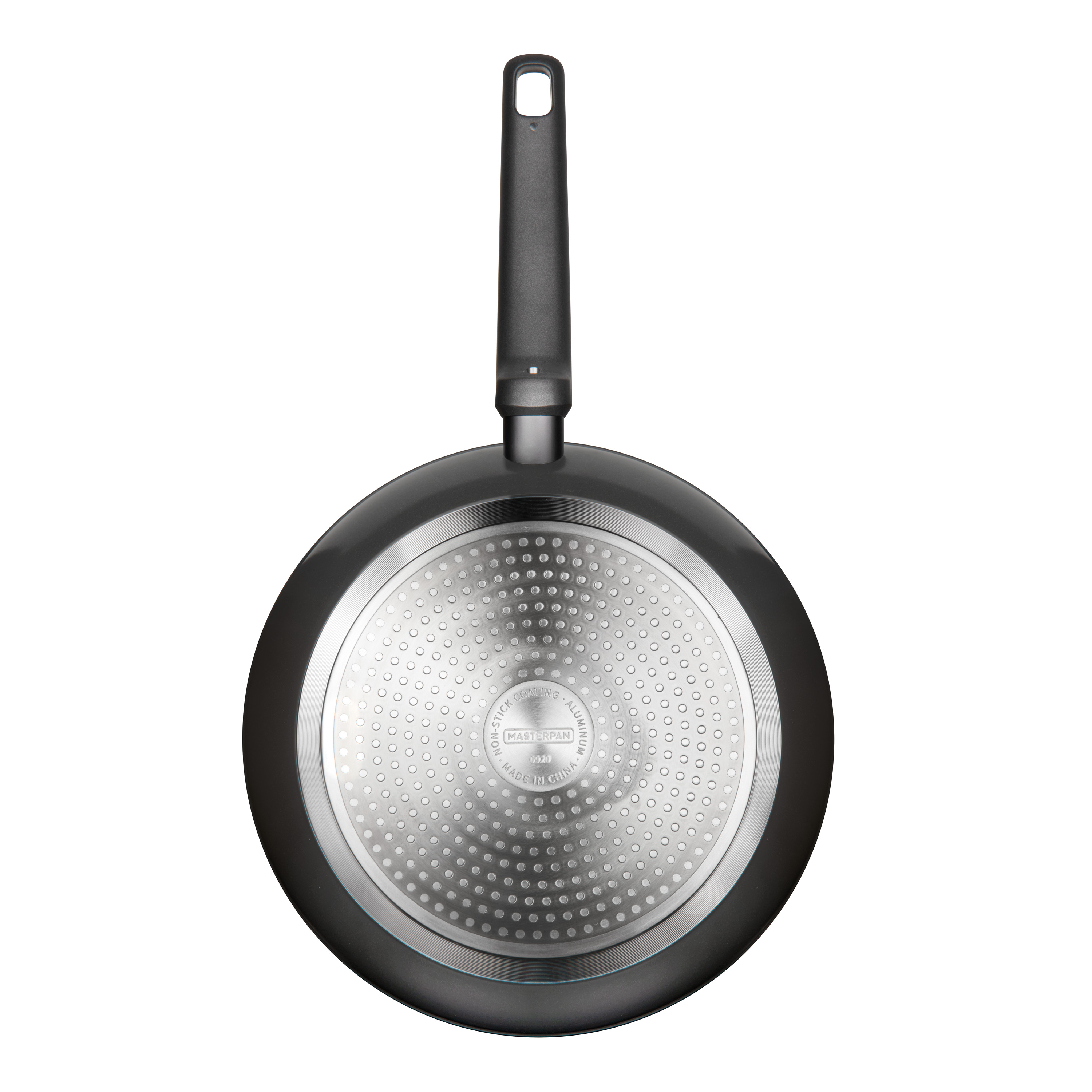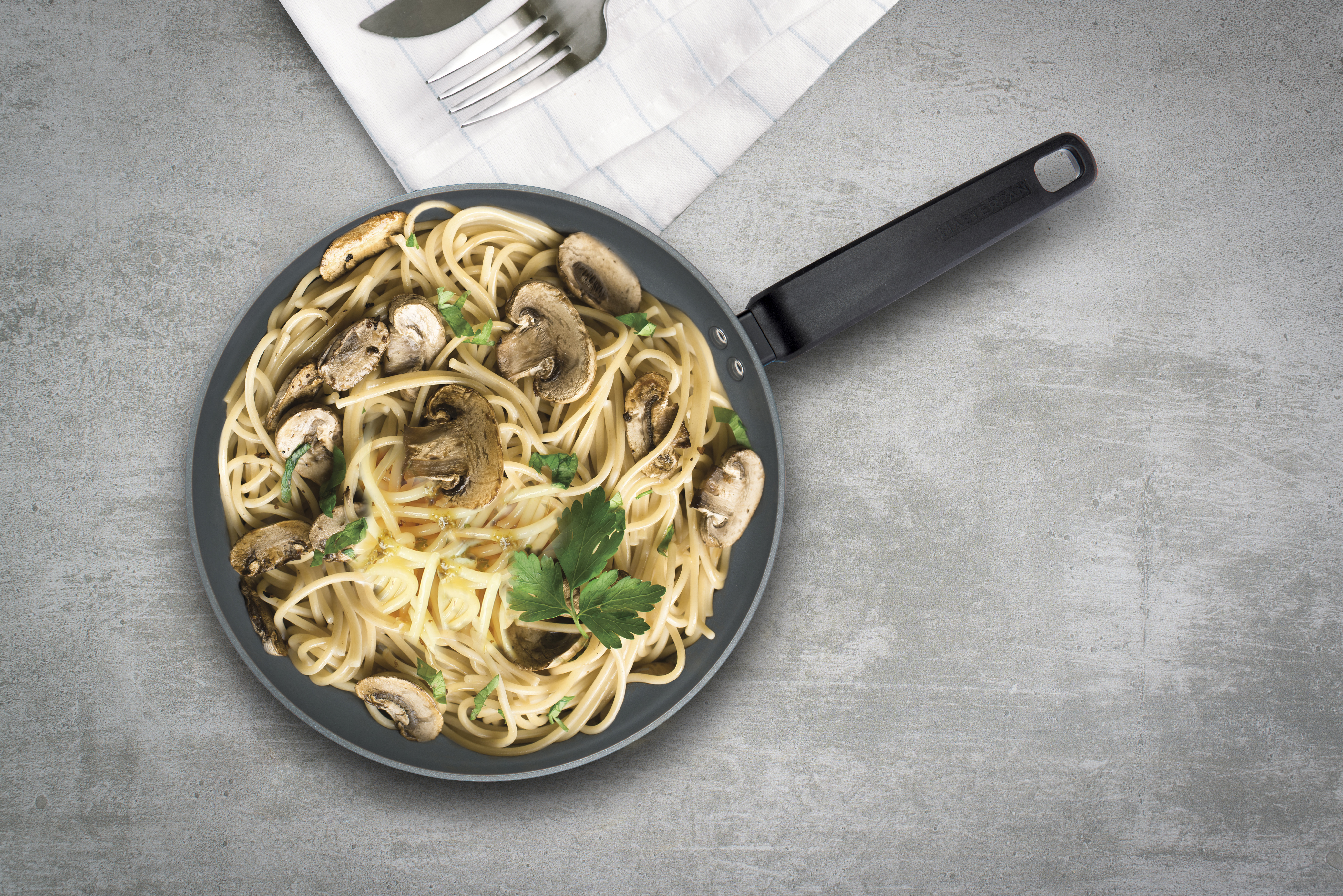 This ceramic frying pan by Masterpan features a cutting-edge ILAG XERADUR 2 ceramic non-stick coating to make cooking with little or no fat simple. Sleek black on the outside, grey on the inside, it’s a stylish option for stove to oven cookware every home chef will love, while the comfortable bakelite handle makes perfecting those techniques easy! With deep sides, this 28cm frying pan takes up minimal space while still offering plenty of capacity, whether you’re simply frying eggs or simmering a full-flavour curry or stew. If you’re looking to save on washing up, this Oven-safe frying pan is a great choice when hob dishes need crisping, withstanding heats of up to 200°C for 30 minutes. Its non-stick coating makes it a great choice of cookware for whipping up a frittata, and it’s also completely free of PTFE, PFOA, lead, cadmium, and heavy metals. Featuring a warp-resistant cast aluminium base and scratch and abrasion-resistant technology, Masterpan’s non-stick cookware is built to last, keeping your pan looking new for years to come.