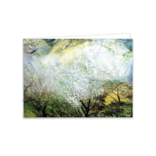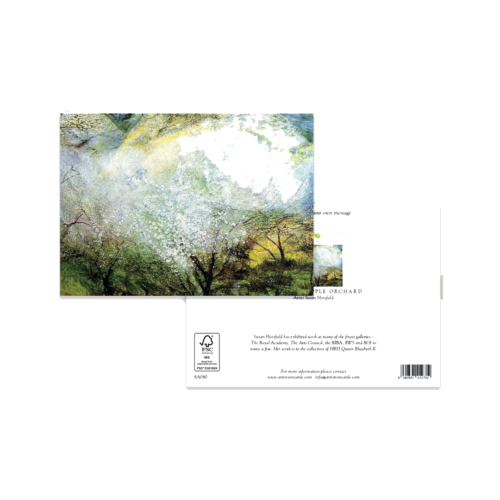 A striking spring landscape from British painter Susan Horsfield, capturing an apple orchard as the blossom breaks into a soft white haze against darker rows and branches. Horsfield layers pastel, chalk and mixed media to suggest wind, scent and light, giving retailers a painterly card that feels fresh and distinctive across occasions.
