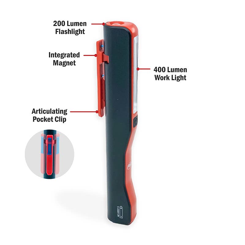 Flipo’s Maximus provides powerful illumination options in an ergonomic and compact body. Each Maximus has two lighting options – a 400-lumen wide area task light and a 200-lumen flashlight. An articulating pocket clip with an integrated magnet allows for convenience and hands-free use when needed most. Made of durable ABS plastic, the Maximus’ contemporary design is available in black/blue, black/orangs & black green. Measuring approximately 7 ¼” x 1 5/16” x 7/8”, the Maximus is packaged in attractive Try Me! packaging and arrives in a PDQ display with 4 of each color. Each Maximus requires 3 AAA batteries, (included).