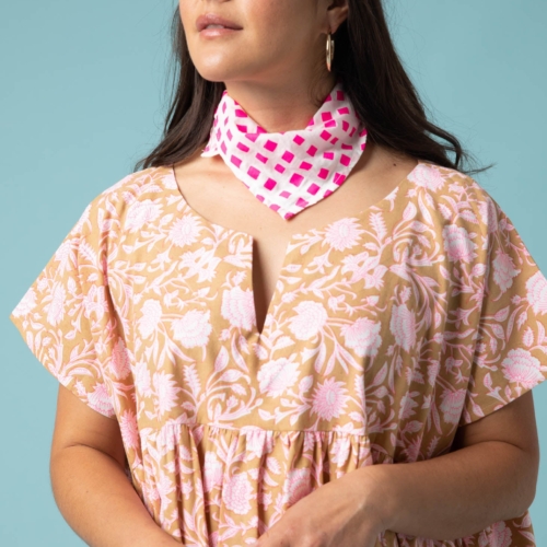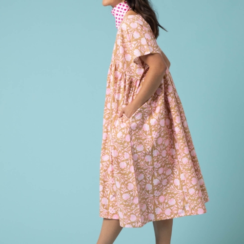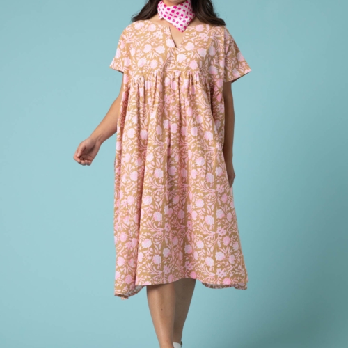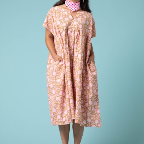 Your get dressed in 10 seconds dress! The Meadow Dress is a favorite, for good reason… It is ethically handmade in organic cotton and no two are alike, there will be small differences in the design but that is what makes it special for you. Fashioned in small batches in a sustainable and conscious manner. Great drape and flowy unstructured cool vibe that is a must this season. Did I mention pockets! This style dress is generous and comes in one size that fits size small to and extra large. Emi is 5’7″ wearing O/S. Organic Cotton Length Shoulder to Hem: 44″ Chest measurement: 28″ Block printed floral design Tier flowy style Semi V-neck Relaxed fit Drop shoulder Short sleeve Hidden side pockets One Size Fits Most (S – XL) Machine washable Made in India