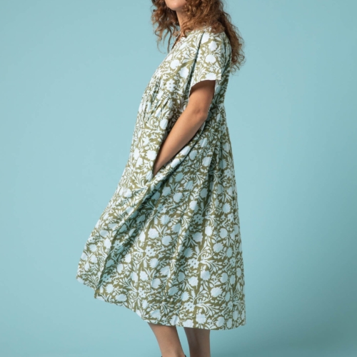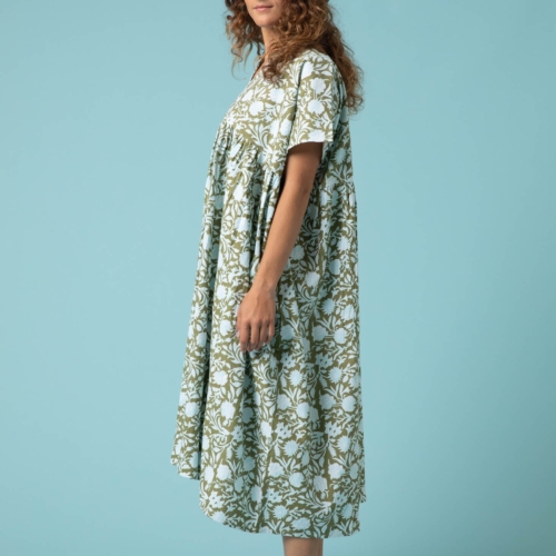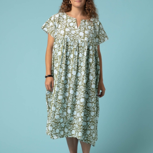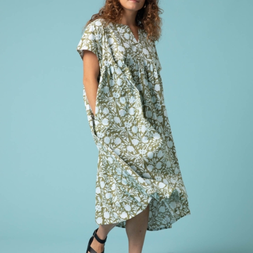 Your get dressed in 10 seconds dress! The Meadow Dress is a favorite, for good reason… It is ethically handmade in organic cotton and no two are alike, there will be small differences in the design but that is what makes it special for you. Fashioned in small batches in a sustainable and conscious manner. Great drape and flowy unstructured cool vibe that is a must this season. Did I mention pockets! This style dress is generous and comes in one size that fits size small to and extra large. Carmen is 5’7″ wearing O/S. Organic Cotton Length Shoulder to Hem: 44″ Chest measurement: 28″ Block printed floral design Tier flowy style Semi V-neck Relaxed fit Drop shoulder Short sleeve Hidden side pockets One Size Fits Most (S – XL) Machine washable Made in India
