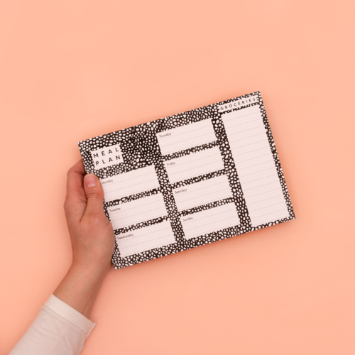 Our Meal planner comes with the addition of a handy perforated tear-off grocery list and has 52 pages to last one year. The pad is produced using 100% recycled paper and hand glued with green pigment. Supplied plastic-free.