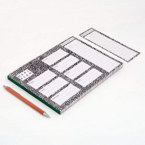 Our Meal planner comes with the addition of a handy perforated tear-off grocery list and has 52 pages to last one year. The pad is produced using 100% recycled paper and hand glued with green pigment. Supplied plastic-free.
