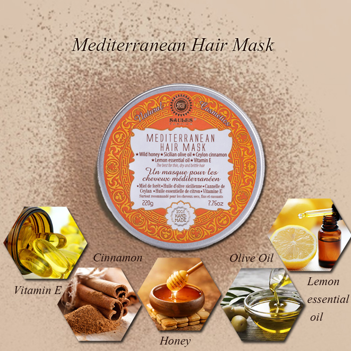 Mediterranean Hair Mask nourishes, hydrates, strengthens hair and prevents hair loss. Wild honey strengthens and thickens hair shafts, supplying them with nutrients. Sicilian olive oil reinvigorates hair bringing back its natural beauty. The olive oil helps to remove dandruff, to accelerate hair growth and to recover hair softness and gloss. Ceylon cinnamon has an antioxidant effect and stimulates blood circulation. Cinnamon provides for vividness and silky shine of the hair, increasing its growth and regenerating its structure. Lemon essential oil prevents dandruff and hair loss.