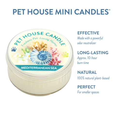 Mediterranean Sea transports you to a turquoise ocean under blue skies and sunshine. This tranquil marine scent is blended with floral accents, lemon and lime, and a hint of sweet amber musk to create a clean refreshing fragrance. ***All 1.5 oz. candles ship in cases of 12. You can mix a case with up to two fragrances (six units per fragrance).***One Fur All Products may not be sold on Amazon, Ebay or other 3rd party websites.Get rid of odors and freshen your home with a Pet House Mini Candle from One Fur All! Designed and formulated to neutralize odors in the smaller spaces of your home, these candles are a must-have for both dog and cat owners. While most candles simply mask smells, our blend includes an odor neutralizer that leaves your home clean, welcoming, and undeniably fresh. Thanks to natural plant-based wax and a cotton wick, our mini candles last for up to 12 hours!
