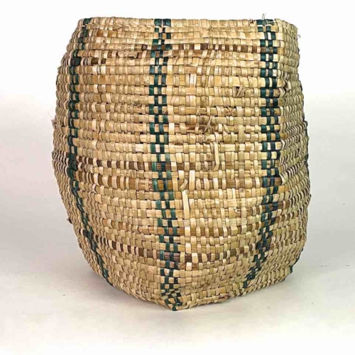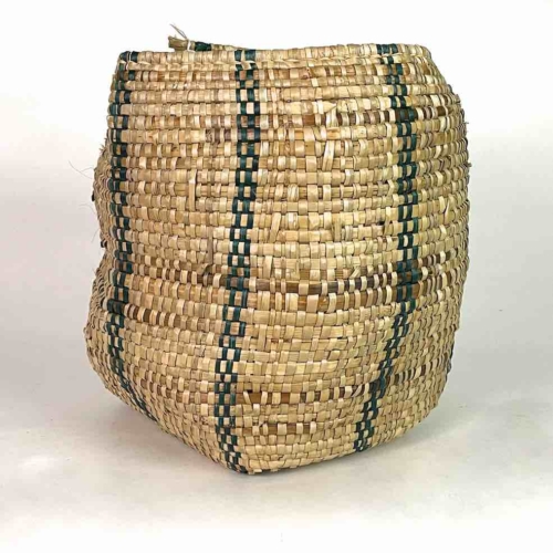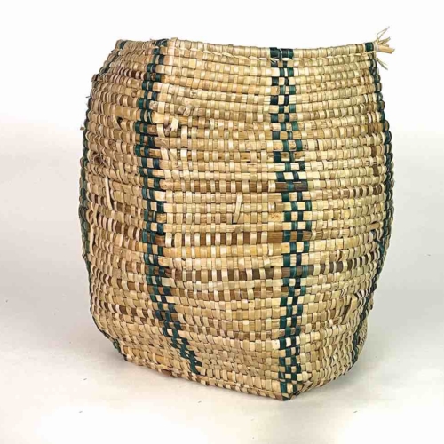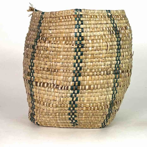 Handwoven from local swampgrass in the lowlands of coastal Togo, West Africa this baskets is the natural color of the straw, decoratively accented with dark green vertical stripes. This basket is not a replica: it is a one of a kind product, originally made for local tribal use. The Mina people in this area of Africa use this basket to carry just about anything they need to carry, to store items and to keep items available in markets for sale. This basket is 12 1/2″ tall (32 cm)